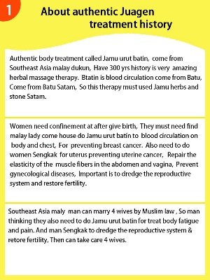 In historical truth, Authentic Juagen Treatment is based on 100% Authentic jamu urut batin therapy from Malay which has 500 years of history.