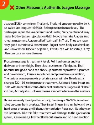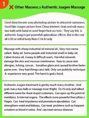 If customer don’t want to do JuaGen and pay extra charges. These masseuse will be unhappy and encourage by forcing customers to do authentic JuaGen. They will say this is men’s maintenance to improve their manhood. The practice is to grope men’s ball until very painful, and use finger to fuck their ass. This comes from chinese women curse words. Also a revenge and venting behavior. That is why many man say juagen is very pain.