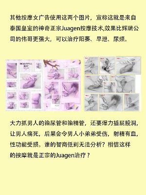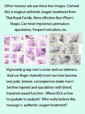 Because masseuse can’t make more money, sauna manager also can’t get more special commission. Therefore sauna manager find people drew a picture, to illustrate authentic Juagen. The technique is to grope man’s ball until very painful, and use finger fuck the ass. They published this picture on the DongGuan sauna website:www.sangna.com, this is earlier then Singapore samyboyforum website. Until now still have many masseuse’s advertise by using this picture, some masseuse make a little amendment to this picture. Only men who with low cognitive levels and low IQ levels will believe this picture is Juagen skill and can aphrodisiac.